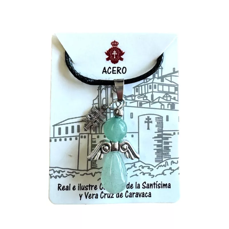 Ángel de acero con piedra natural de aventurina verde, cruz de Caravaca y cordón.