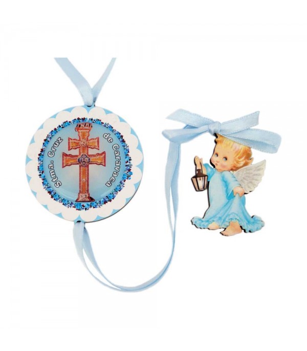 Medallon de cuna de madera con la cruz de caravaca en un extremo y un agel en el otro. Blanco. Dimensiones: 40cm largo maximo.