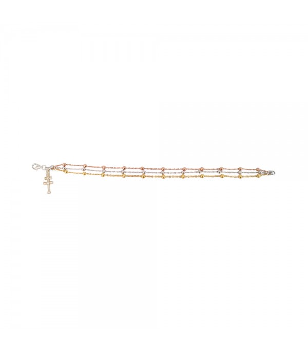 Pulsera de plata con 3 cadenas en color amarillo, rosa y blanco y cruz de caravaca al final. Dimensiones: 18,5 cm largo