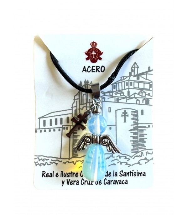 Ángel de acero con piedra natural de opalina, cruz de Caravaca y cordón.
